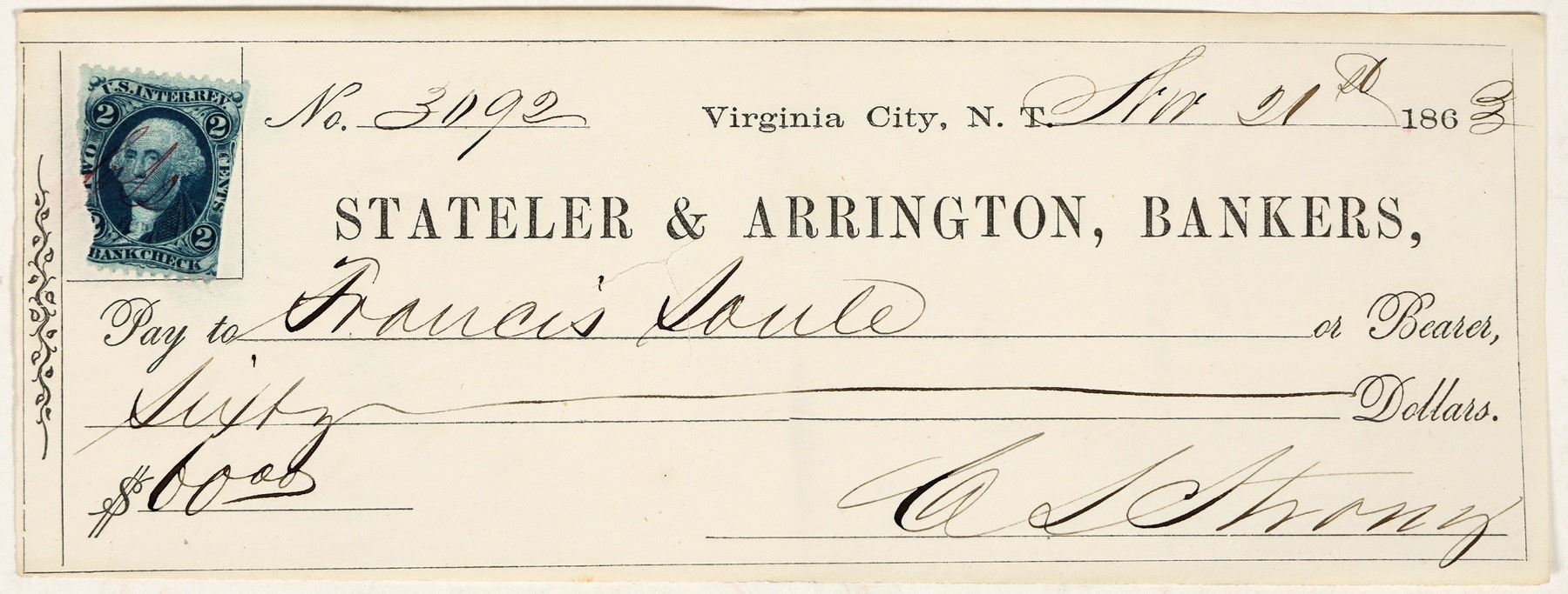 1863 Stateler & Arrington check from the Gould & Curry Mine signed by Charles Strong as supt. Issued to Francis "Frank" Soule, who is listed in the Collins 1864 directory as a miner and a police officer! Soule was questioned in March 1865 for a murder he witnessed at Goodman & Doyle's Saloon on North C Street. John Doyle, proprietor, shot and killed Benjamin Metcalf after the latter threatened him numerous times and approached the bar. Doyle then turned himself in to Soule. (See March 13, 1865 Gold Hill Daily News). In April 1865, Sacramento Duarte, who had robbed a whiskey shop on C Street, claimed to have paid off two police officers, including Soule. We couldn't locate articles to determine if he was convicted of those charges.