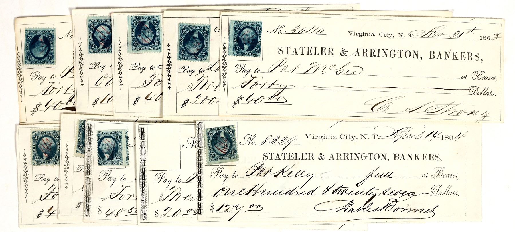 Lot of 10 Stateler & Arrington territorial mining checks issued by the Gould & Curry to Irish miners, incl. Shaughnessy, McBride, McGee, O'Hare, O'Brien, Daly, O'Grady. Kelly, and McMannis. Signed by either Charles Bonner or Charles Strong as supt. The Irish were an important part of the Comstock miners.