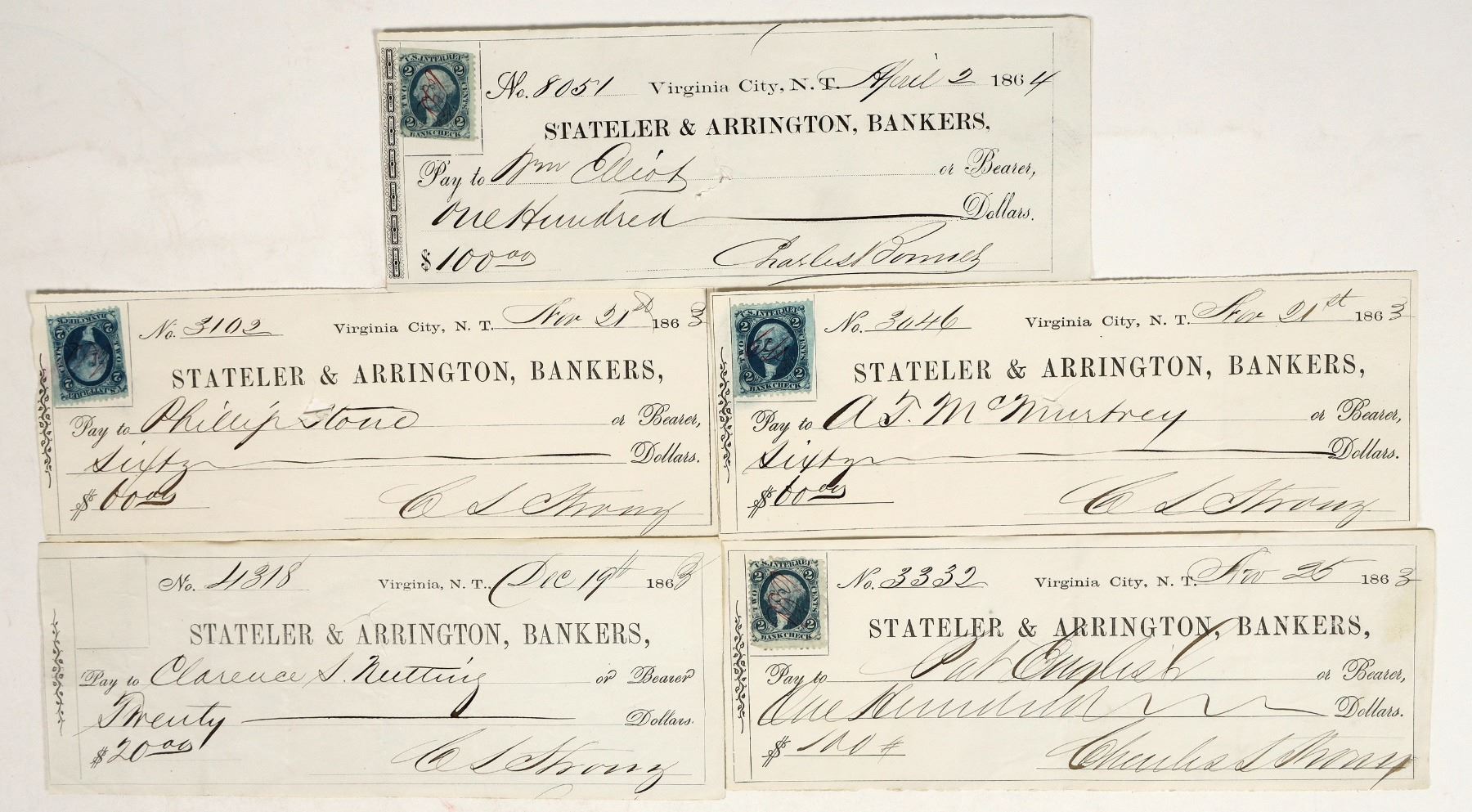 Lot of 5 different Stateler & Arrington checks issued by the Gould & Curry Mine to miners who are also listed in the Collins directory as working for a mine other than the Gould & Curry. Includes: Clarence Nutting (N. Potosi), Phillip Stone (Savage Mine), AF McMurtrey (Potosi), Pat English (Ophir Mine), and William Elliot (Bowers Mine). Four checks signed by Charles Strong, one by Charles Bonner.