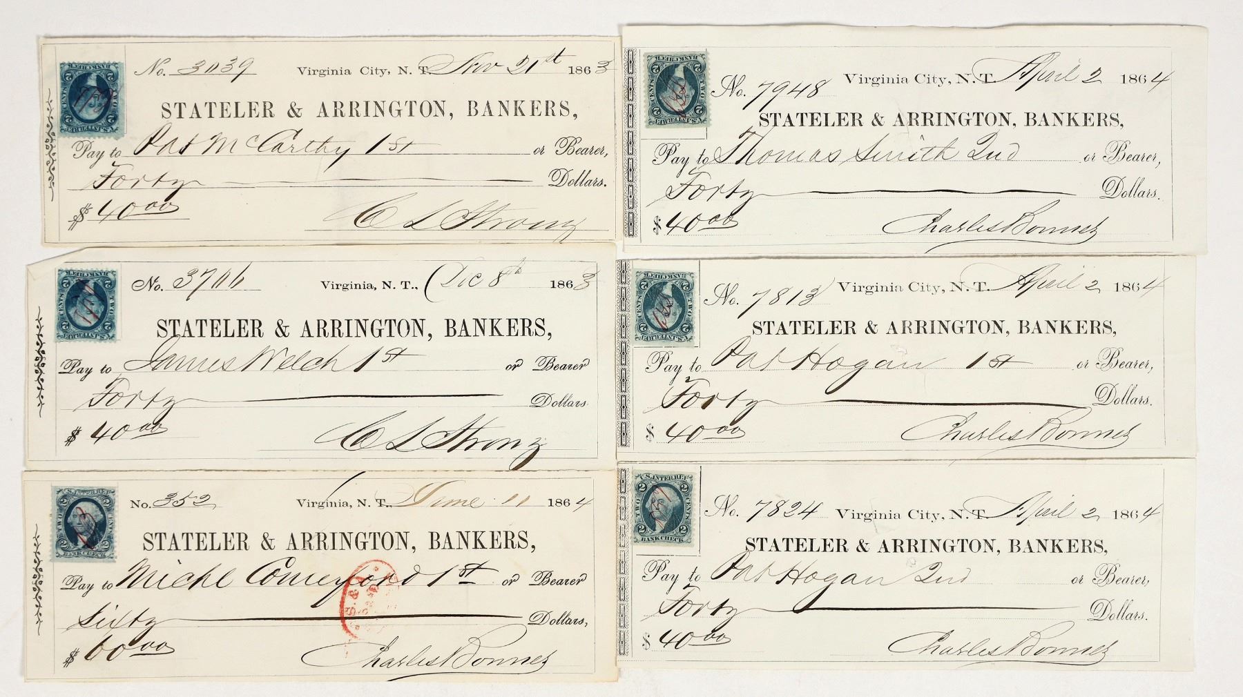 Lot of 6 Stateler & Arrington, Gould & Curry Silver Mining checks issued to miners with the same name, as denoted by "1st" or "2nd" after their name. Fun group! Includes: Michael Comerford (1st), Pat Hogan (1 and 2), Thomas Smith (2nd), Pat McCarthy (1st), and James Welch (1st). Signed by either Charles Strong or Charles Bonner as supt.