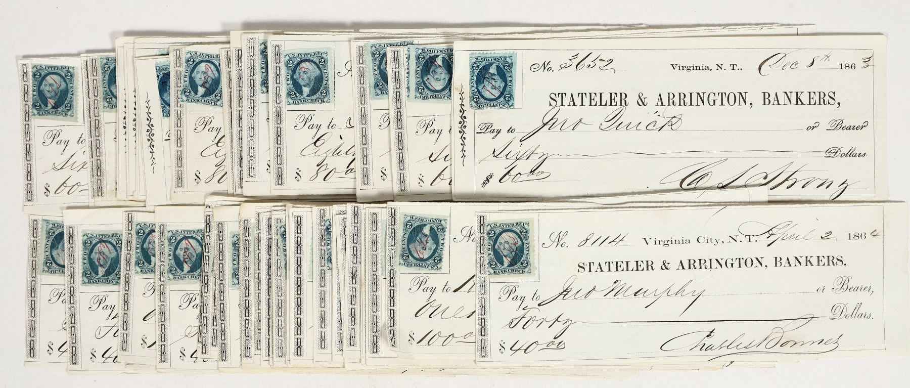 Lot of 50 checks issued by the Gould & Curry, all to miners and workers of the company listed in the 1864 Collins directory (available online for free). This is a great group of confirmed miners! Issued in 1863-64, a good split between Charles Strong and his successor Charles Bonner, who took over after Strong's mishandling of the extremely expensive company mill. Strong would later commit suicide. Please inspect.