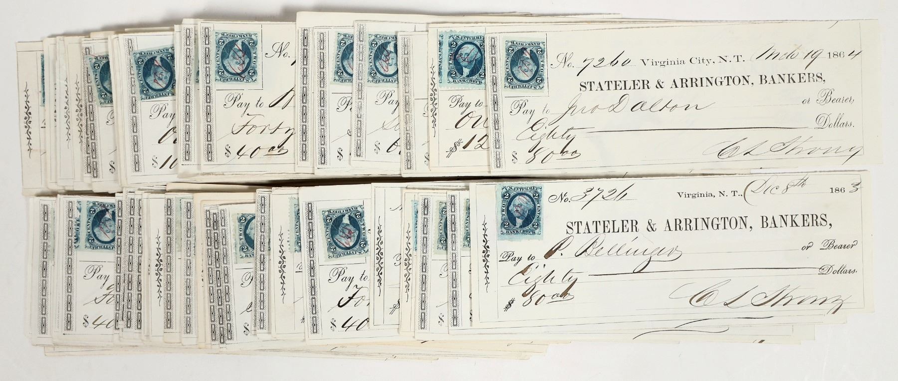 Lot of 100 Stateler & Arrington checks issued 1863-64 for the Gould & Curry Silver Mining Company. Signed by either Charles Strong or Charles Bonner as supt. Bonner replaced Strong after his mishandling of the incredibly expensive G&C mill. These checks are likely issued to miners or mill workers. Great archive and resale lot.