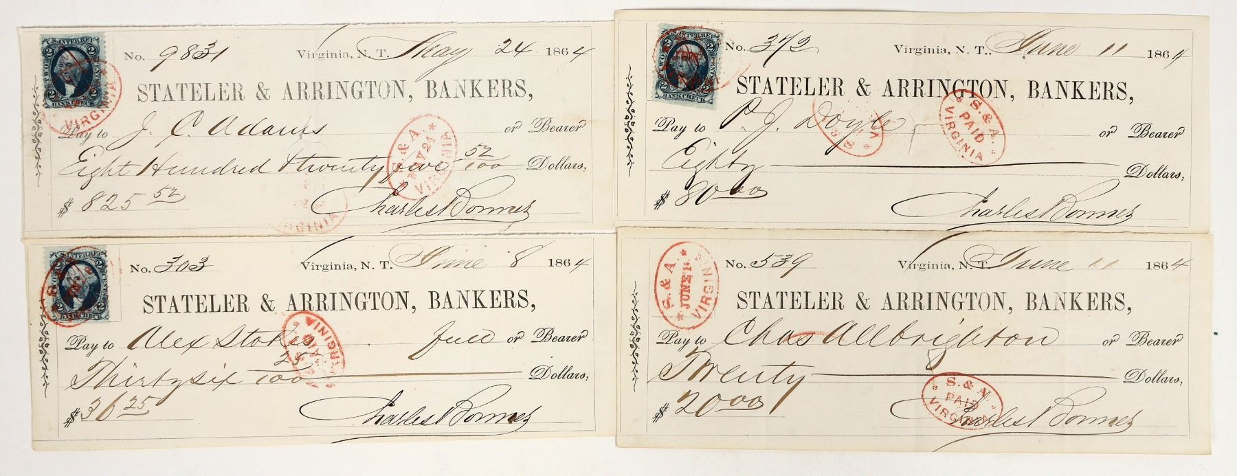 Lot of 4 Stateler & Arrington checks issued in 1864 by the Gould & Curry, signed by Charles Bonner. All have the red cancel stamps used by the bank, but these examples have multiple. One was even cancelled without a stamp there!