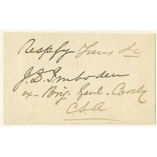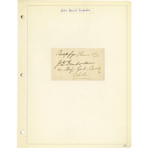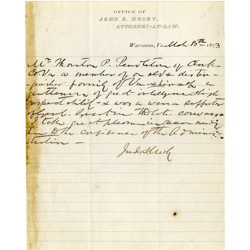 <B>Virginia Confederates Ashby, Imboden and Mosby Autographs</B></I> Turner Ashby, John Imboden and John Singleton Mosby were true cavaliers of the Old Dominion. Mosby, although never attaining a general's collar wreath, certainly deserves inclusion in this lot.<BR><B>Turner Ashby</B></I>- ADS on March 2, 1862 C.S. requisition form. Fine condition.<BR><B>John D. Imboden</B></I>- Signature card with rank below. Fine condition.<BR><B>John S. Mosby</B></I>- ALS on his business stationery, March 15, 1873. stains along left margin, else fine condition.<BR><BR><b>Shipping:</b> Small Collectibles (<a target="_blank" href="http://www.heritageauctions.com/common/shipping.php">view shipping information</a>)