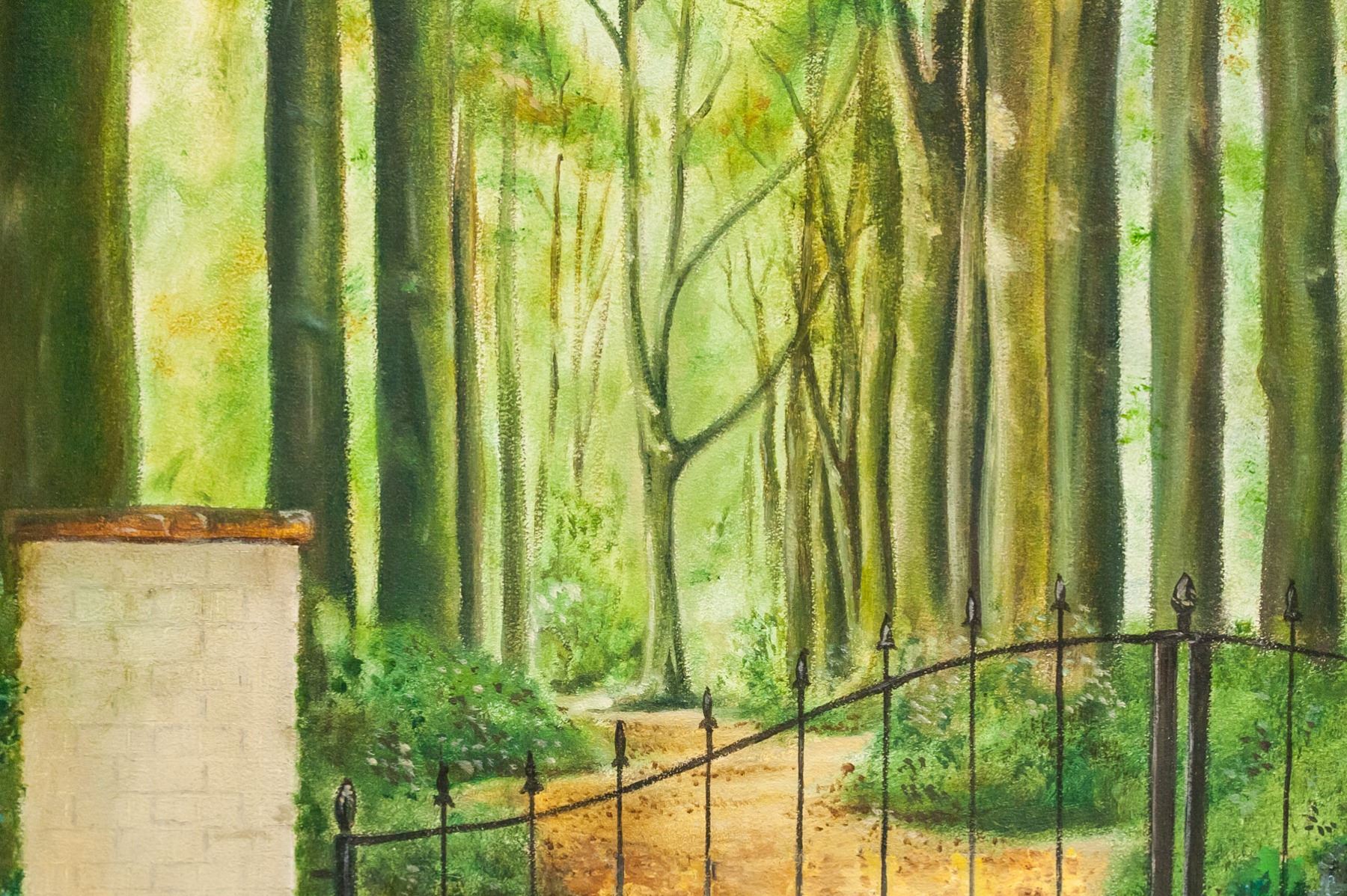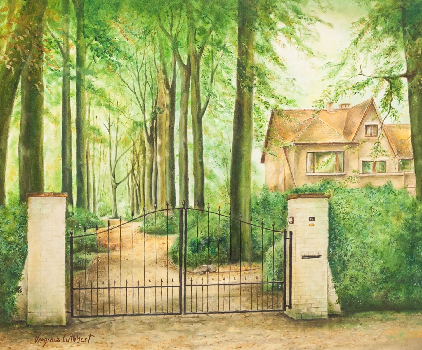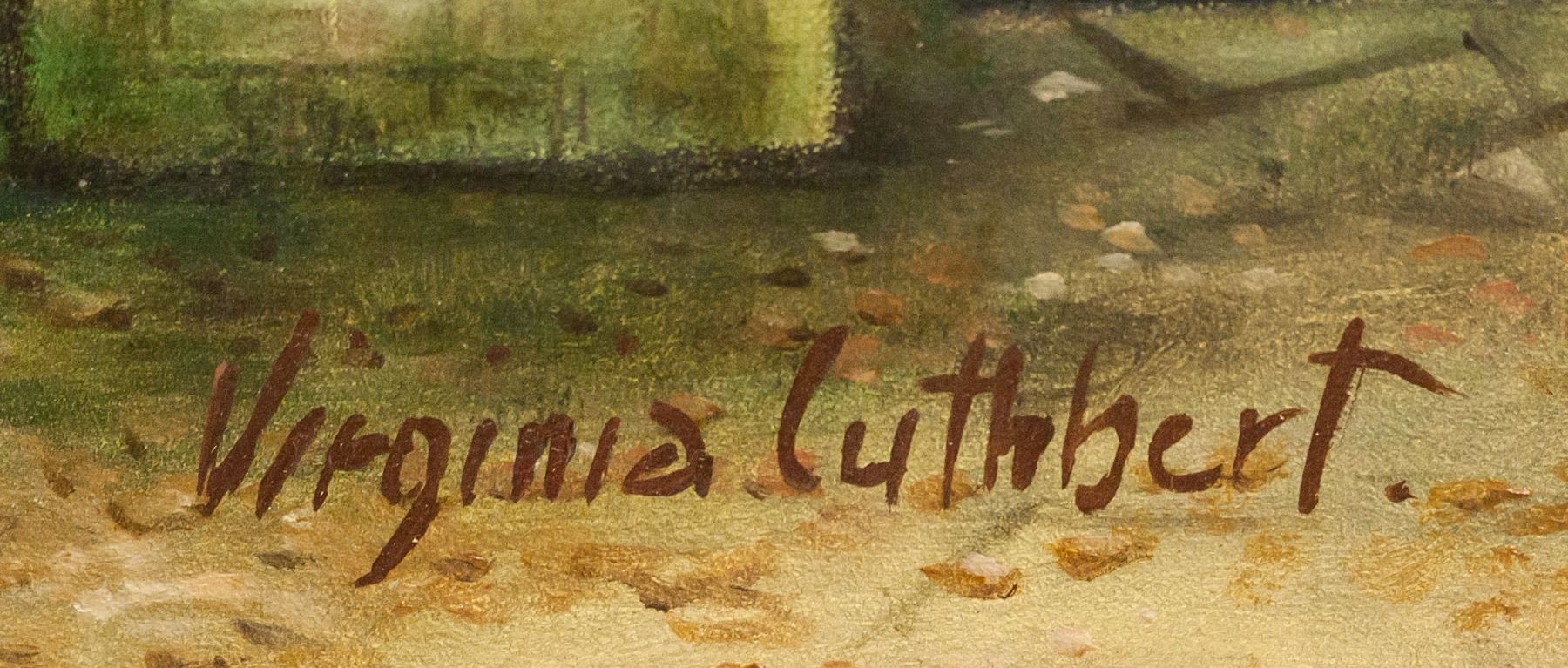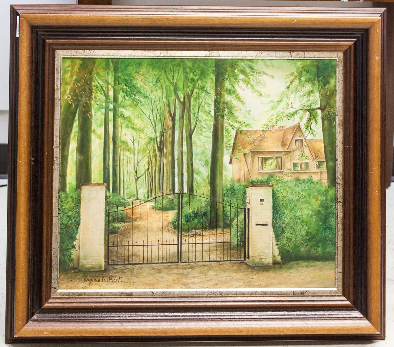 Oil on board, framed. Featuring a house with a gated driveway with an avenue of trees. Signed "Virginia Cuthbert" to the bottom left. Attributed to Virginia Cuthbert (1908-2001, American). Board size: 48 x 58 cm (19 x 23 inches). Frame size: 71 x 81 cm (28 x 32 inches).