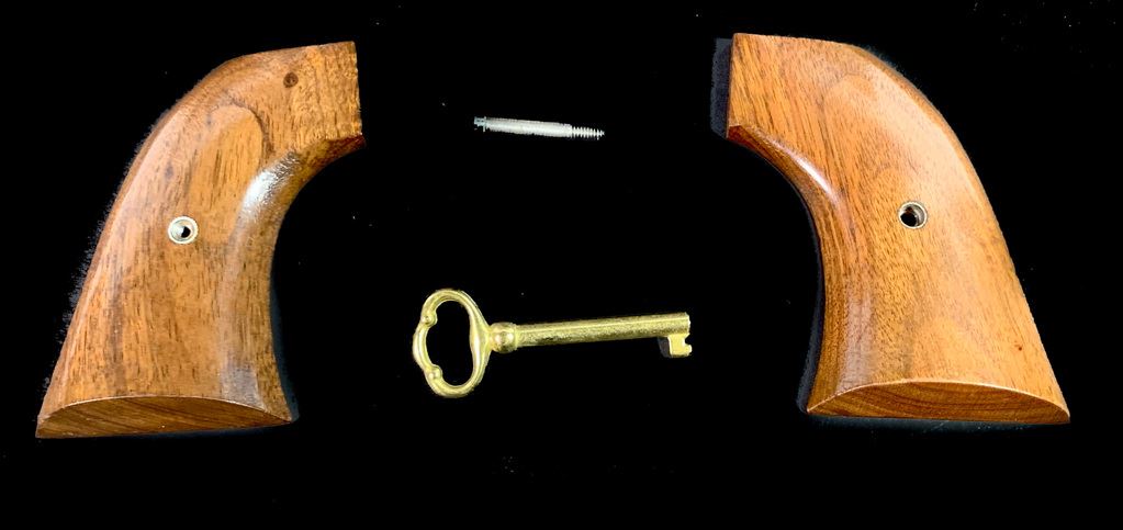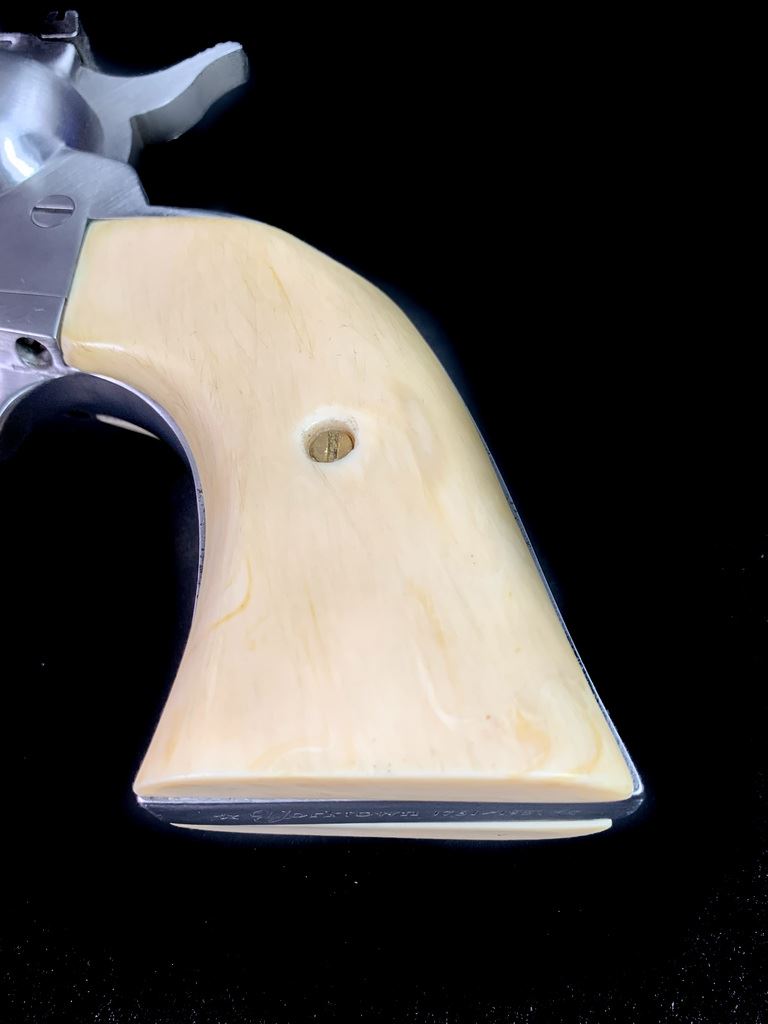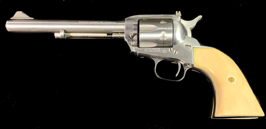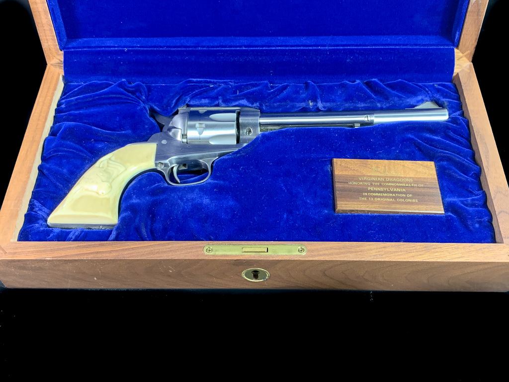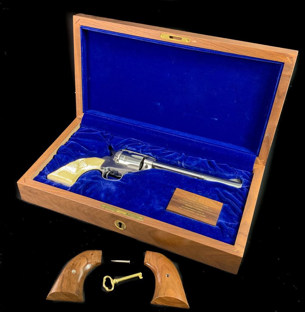 Same size as Ruger Super Blackhawk but much finer action. High quality and tight tolerance. 1981 production. Marked "Yorktown 1781-1981". Comes in very rare factory velvet lined case with commemorative plaque. 7 1/2" barrel. 99% condition. Includes both factory walnut and western style composite steer head grips. SN S23937