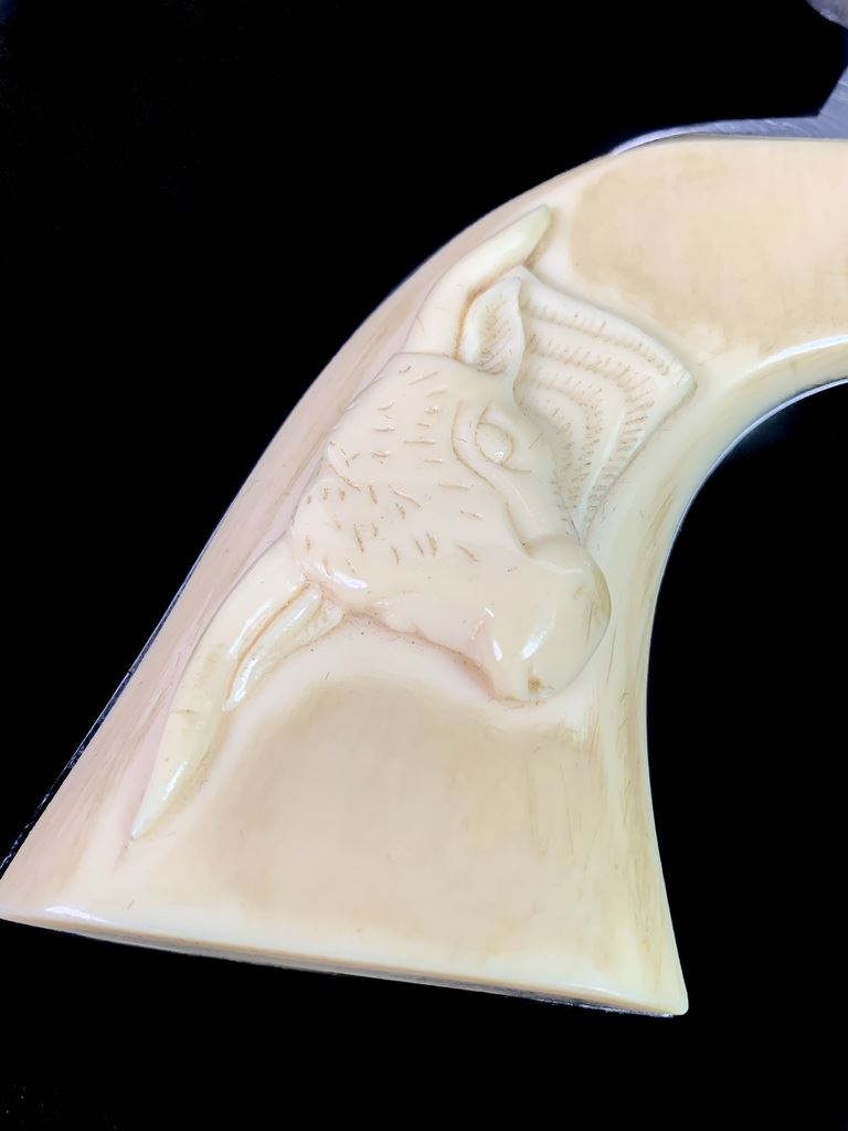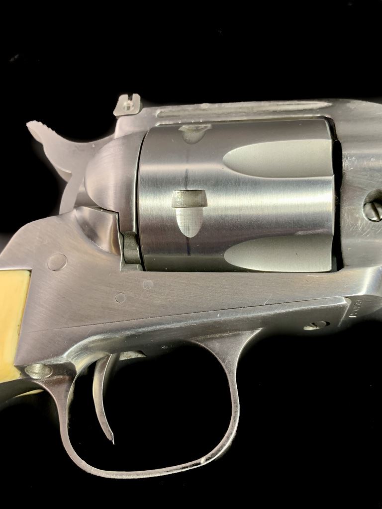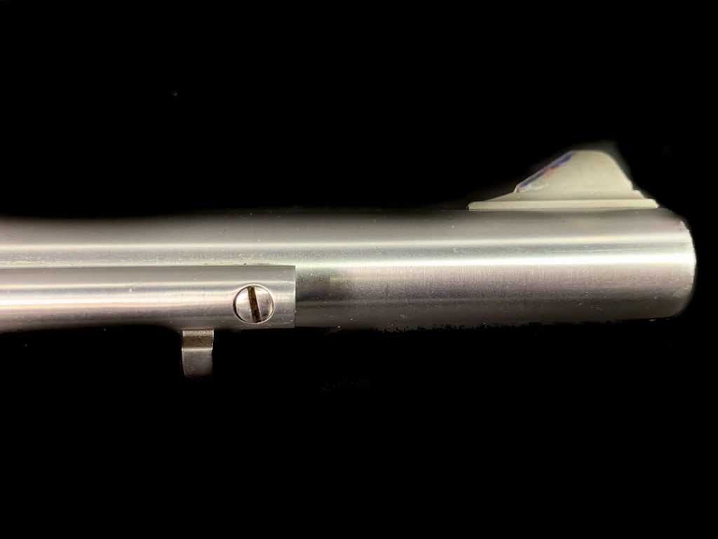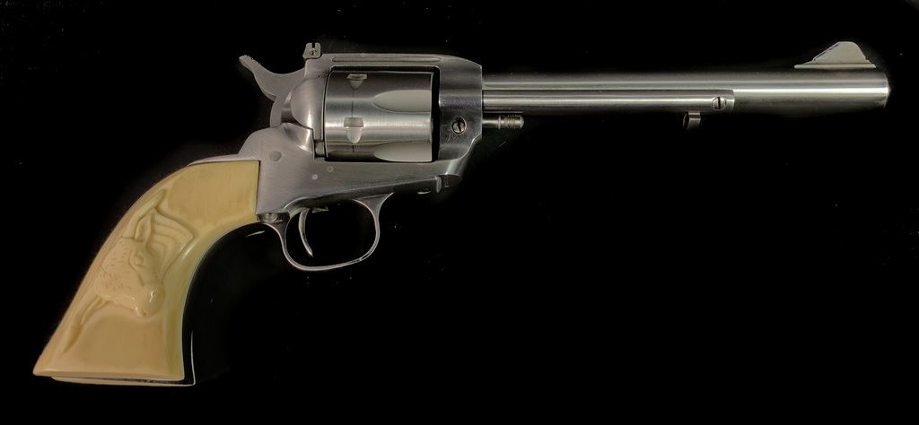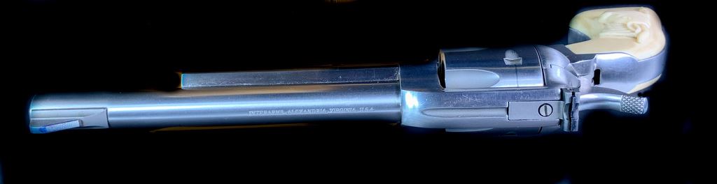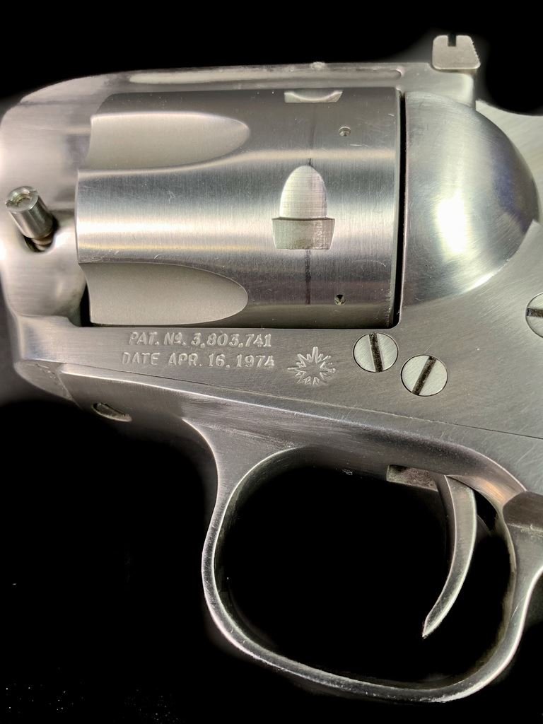 Same size as Ruger Super Blackhawk but much finer action. High quality and tight tolerance. 1981 production. Marked "Yorktown 1781-1981". Comes in very rare factory velvet lined case with commemorative plaque. 7 1/2" barrel. 99% condition. Includes both factory walnut and western style composite steer head grips. SN S23937