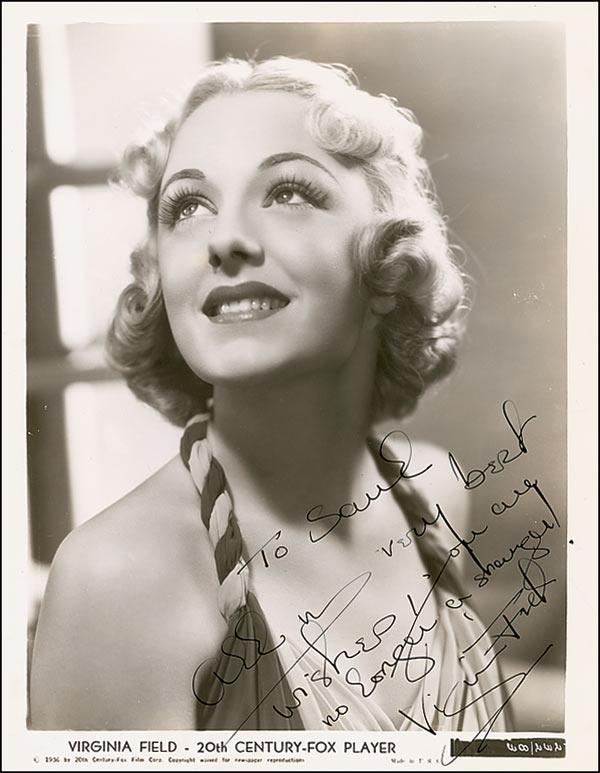 British actress (1917–1992) who appeared in Little Lord Fauntleroy and in the Mr. Moto movie series. Vintage glossy 8 x 10 20th Century Fox publicity photo of Field looking skyward, signed and inscribed in-person in fountain pen “To Saul, All my very best, you are no longer a stranger. Virginia Field.” In fine condition, with a few surface marks and dings. The Saul Goodman collection.