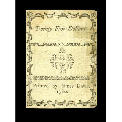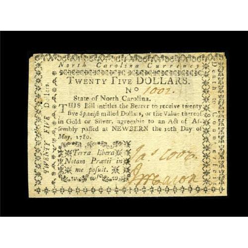 <B>North Carolina May 10, 1780 $25 Extremely Fine.</B></I> There are six different varieties of this denomination, each distinguished by its Latin motto which on this note reads, "<I>Terra libera Notan Praetii in me posuit," </B></I>which loosely translates to "a free land placed value on me." This issue is virtually never seen in this grade and is not priced above VF in either Newman or Friedberg. Light folds are found on this note that has three repairs. <BR><BR><b>Shipping:</b> Coins & Currency (<a target="_blank" href="http://www.heritageauctions.com/common/shipping.php">view shipping information</a>)