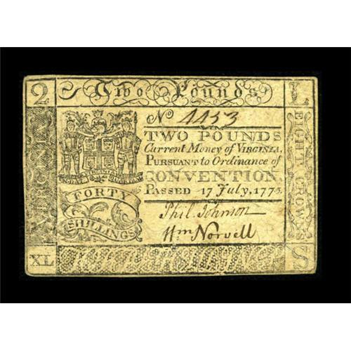<B>Virginia July 17, 1775 £2 Extremely Fine.</B></I> A couple of light center folds are seen on this nicely margined example that has rounded corners. Neither Newman nor Friedberg prices these above the VF grade and this example is certainly nicer than most.<BR><BR><b>Shipping:</b> Coins & Currency (<a target="_blank" href="http://www.heritageauctions.com/common/shipping.php">view shipping information</a>)