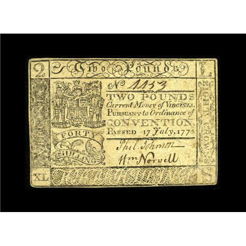 <B>Virginia July 17, 1775 $2 Extremely Fine.</B></I> A slight center fold is seen on this wonderfully margined example that has rounded corners. Neither Newman nor Friedberg prices these above the Very Fine grade, and this example is nicer than most.<BR><BR><b>Shipping:</b> Coin/Currency (<a target="_blank" href="http://www.heritageauctions.com/common/shipping.php">view shipping information</a>)