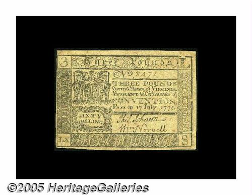 <B>Virginia July 17, 1775 L3 About New.</B></I> This is the smaller size variety from this issue. It's boldly signed with tremendous print quality for a Virginia Note. It has at least some margin all the way around with very large margins on three of the four sides. A tough colony from which to find attractive notes.
