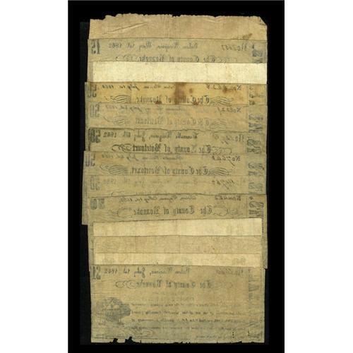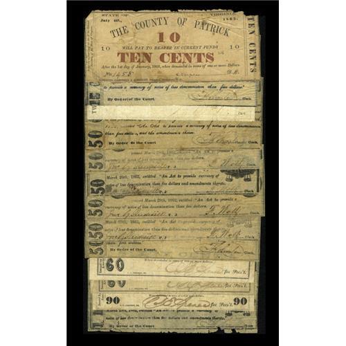 <B>Virginia Local Government Scrip Issues.<BR>Christiansburg, VA - County of Montgomery</B></I> 25¢ Aug. 1, 1862 <B>Fine+</B></I><BR><B>Fincastle, VA - County of Botetourt</B></I> 50¢ July 5, 1862 with the Scales of Justice descending from the clouds, two examples, <B>VF,</B></I> VG, 50¢ July 5, 1862 with two vignettes of Washington, two examples, both <B>VF<BR><B>Lynchburg, VA - City of Lynchburg</B></I> 60¢ May 1, 1862, two examples, <B>VF, About Fine,</B></I> 90¢ May 1, 1862 <B>VF<BR>Patrick County, VA - County of Patrick</B></I> 10¢ July 4, 1862 <B>VG,</B></I> tattered edges<BR><B>Salem, VA - County of Roanoke</B></I> 15¢ May 1, 1862 <B>Fine,</B></I> edge splits, 50¢ May 1, 1862 <B>Fine,</B></I> 50¢ July 1, 1862 <B>VF</B></I> minor stains, $1 July 1, 1862 <B>VG-Fine</B></I>.