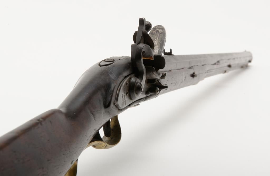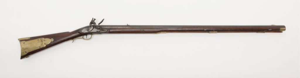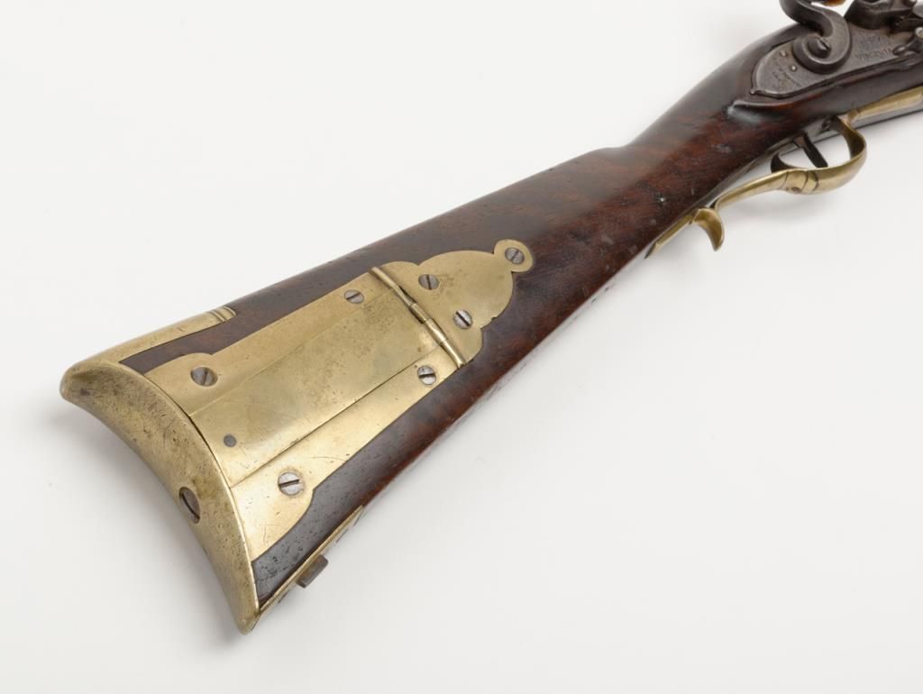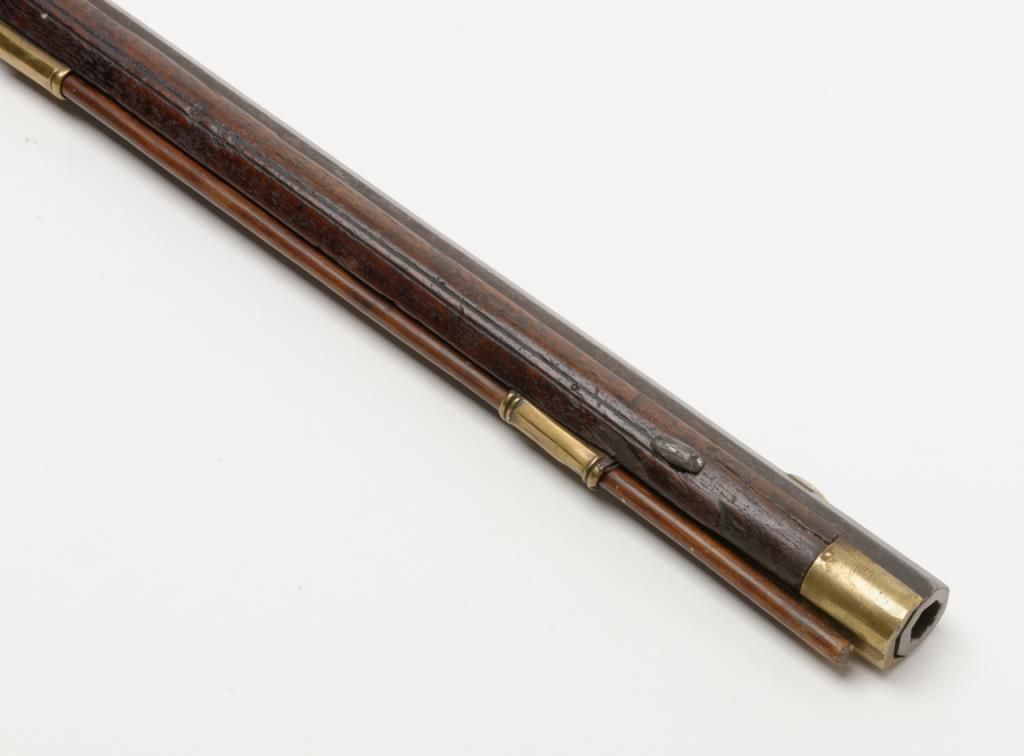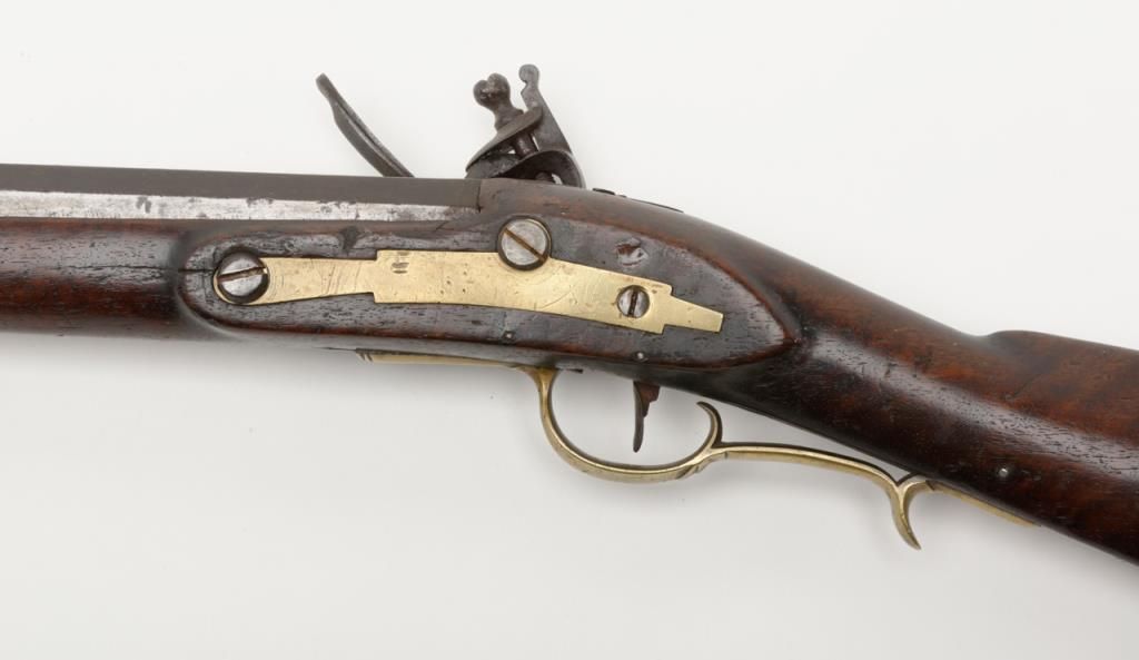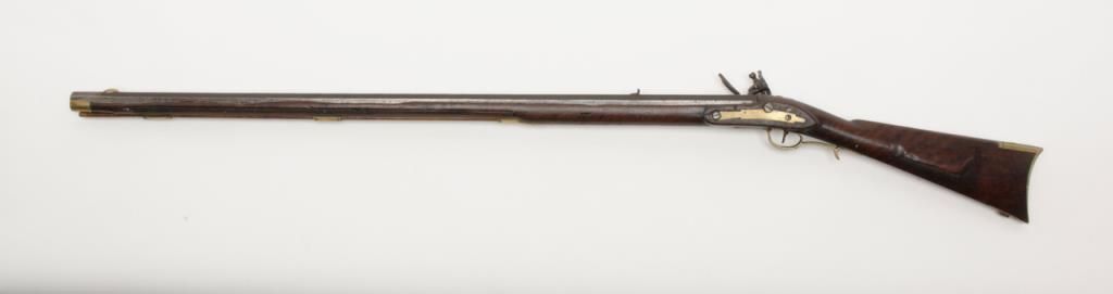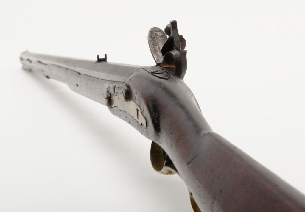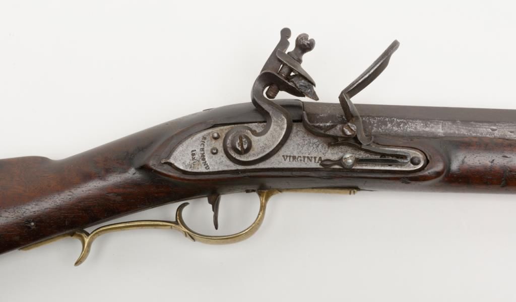 Virginia Manufactory 2nd model flintlock rifle dated 1820 on rear of lock in .50 caliber, full stocked with brass mounts showing “VIRGINIA” stamped at the center portion of the lock. Refer Flayderman 9B-018. This rifle remains in originalgood condition showing a dark brown to gray patina finish with some scattered light to moderate erosion and pinprick pitting. There is some slightly heavier pitting around the touch hole and firing areas. The frizzen shows period and oldresurfacing and the lock is in its original flintlock configuration with correct small parts excepting the frizzen spring and screw which are older restorations. The stock is in good condition and would be very good other than losses along the top of the forend on the left side where slivers of wood are missing and extending 19” back from the muzzle along the top edge. There are also many small losses of wood along the top edge on the right side of stock which are all very restorable. The brass mounts show some cleaning long ago and now are aging back. These Virginia rifles are very rare with only 1700 being produced and this is an above average example. Note we could not find another reference of one being