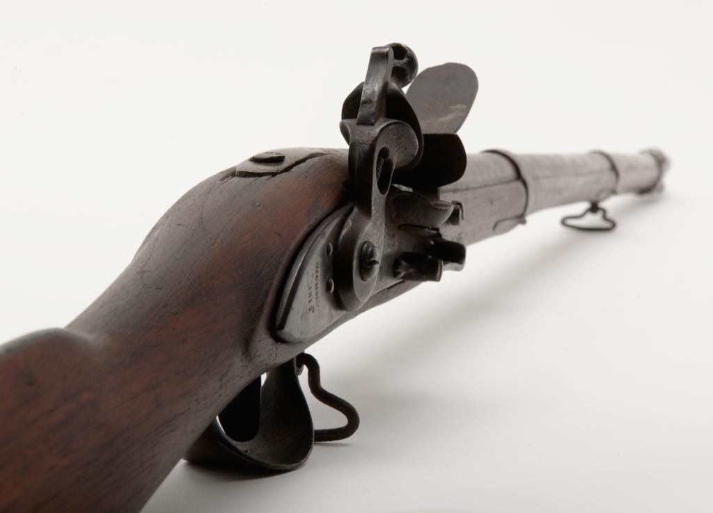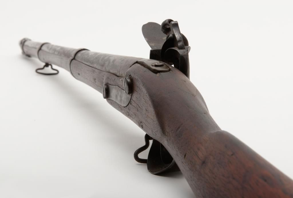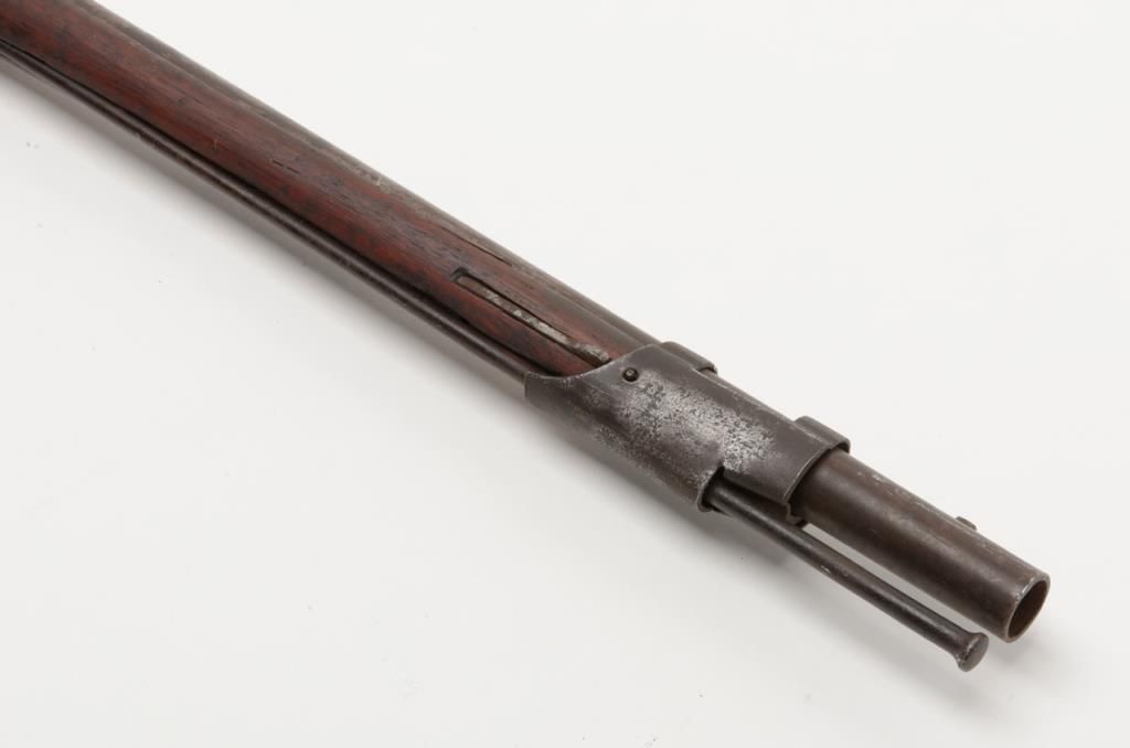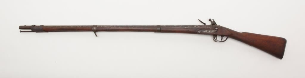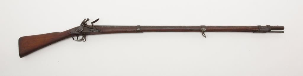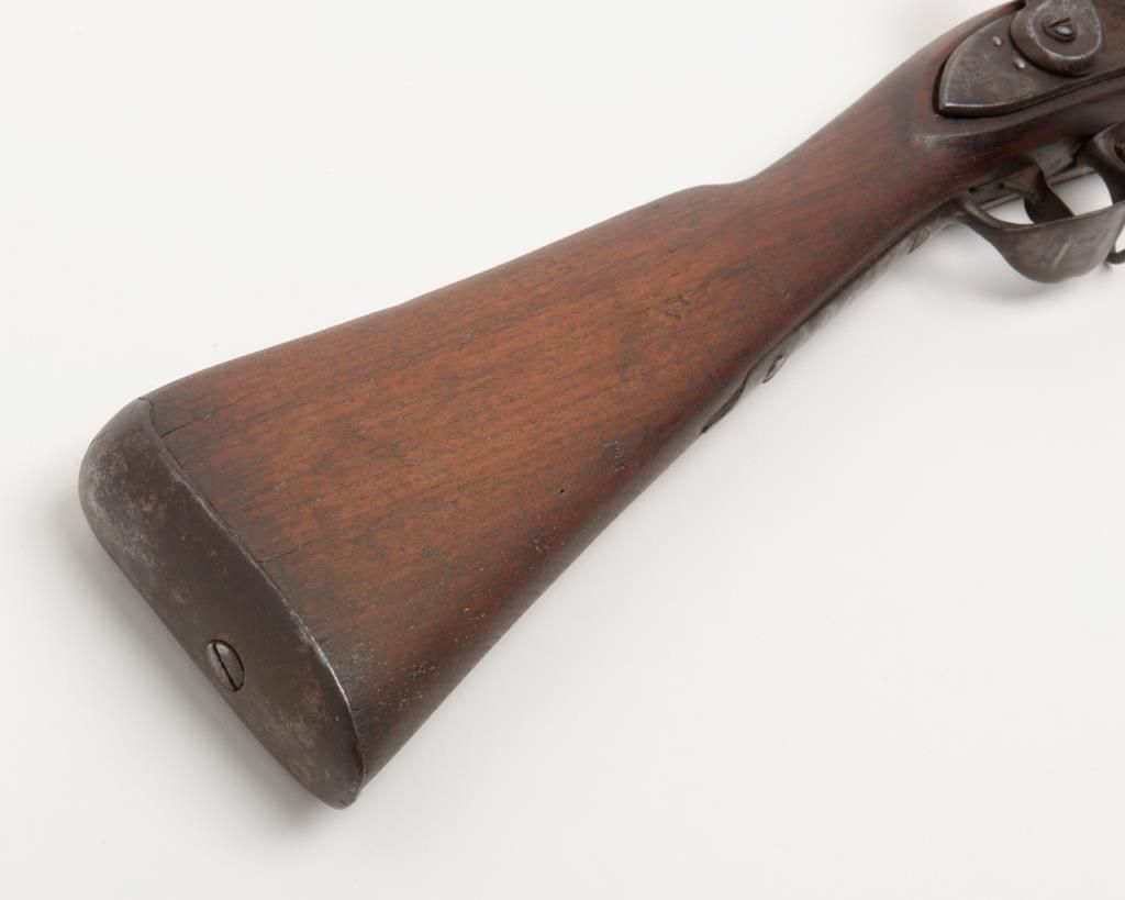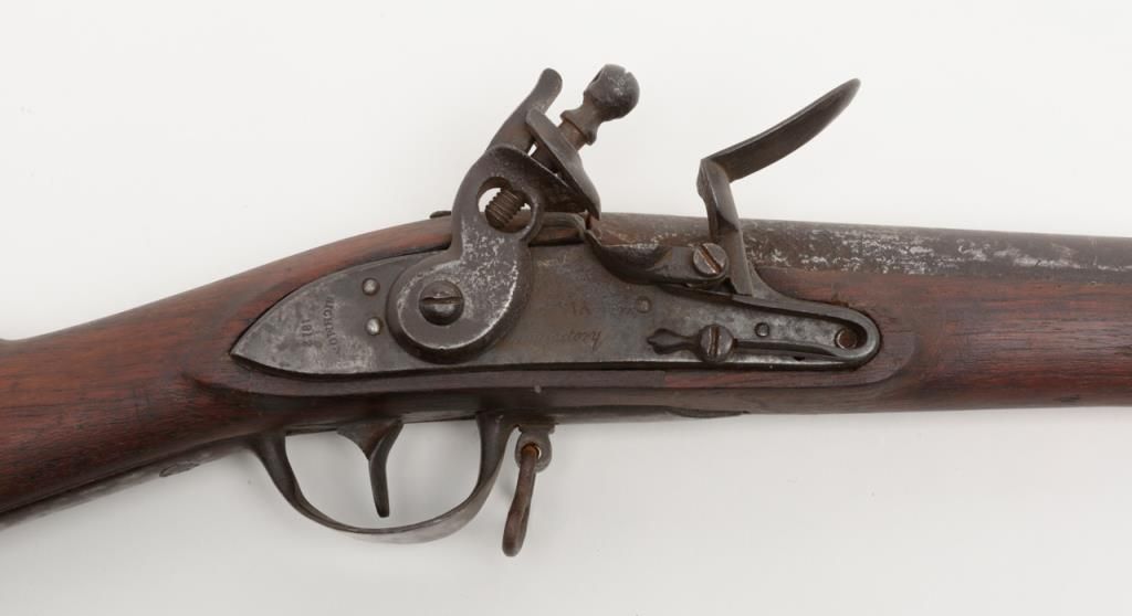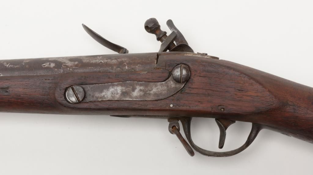 Virginia Manufactory 2nd model musket a.k.a. model of 1812 pattern in original flintlock configuration (Refer Flayderman 9A-179). The musket shows iron mountings and standard length .69 caliber barrel with Richmond and 1812 on therear portion of the lock and the center portion is marked “Virginia manufactory” (Note Vir in Virgina is not legible). The metal surfaces are in fair to good condition showing a dark patina with scattered light to slightly heavy pitting anderosion with the heaviest pitting occurring at the breech end and firing areas from battle use. The touch hole has been enlarged in size and the arm is in its original flintlock configuration with correct hammer, top jaw, screws and parts. Thestock is good with some light cleaning with steel wool or possible slight sanding and is slightly down around the metal. The stock shows normal imperfections and small losses. An original to the period ramrod is included and the front sight onband was smoothed or filed down during use. The original sling swivels are retained. 60,000 of these flintlock muskets were in the Richmond Arsenal at the beginning of the Civil War and were issued to Virigina troops. Refer Flayderman 9A –