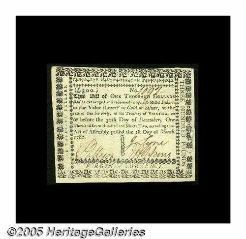 <B>Virginia March 1, 1781 $1000 About New.</B></I> This is the variety on the thicker, soft paper. A small hole has been repaired with tape on the blank back, but the note is very well printed, boldly signed and problem-free save for the previously mentioned plugged hole. One of the nicer looking examples we've seen of this challenging issue.