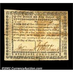 Virginia March 1, 1781 $150 Extremely Fine. There are a few small edge splits, and the top half of t