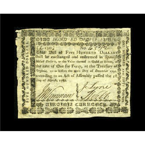 Virginia March 1, 1781 $500 Extremely Fine. The signatu