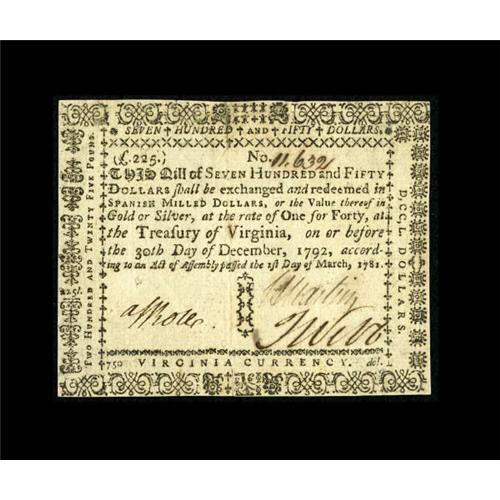 <B>Virginia March 1, 1781 $750 Extremely Fine.</B></I> This piece boasts a full About New appearance, although there are a couple of folds. The face details are solid. The blank back shows a couple of archival tape repairs at the top edge.<BR><I>From The Collection of a Louisiana Gentleman.</B></I><BR><BR><b>Shipping:</b> Coins & Currency (<a target="_blank" href="http://www.heritageauctions.com/common/shipping.php">view shipping information</a>)
