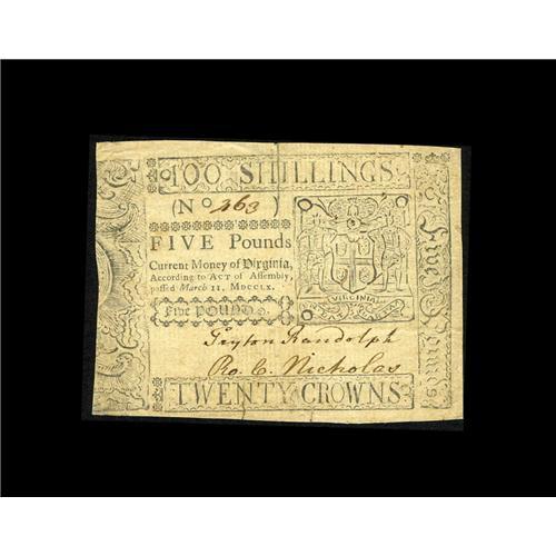 <B>Virginia March 11, 1760 L5 Extremely Fine.</B></I> This is bar none the single rarest Virginia note that CAA has handled in our 40+ sales. It's the first Virginia note dated prior to 1771 that we have handled. All early Virginias are excessively rare, and to have one available in high grade is an opportunity that no serious collector of this colony's notes can afford to let pass. The note is well margined, boldly signed and problem free save for extremely minor edge splits. Truly rare Colonial Currency is one of the most overlooked and underpriced areas in numismatics. It can be decades between opportunities to buy a note of this caliber. Truly high-end Colonial such as this piece can be a real challenge to estimate, but we would be very surprised if this note does not reach or exceed...