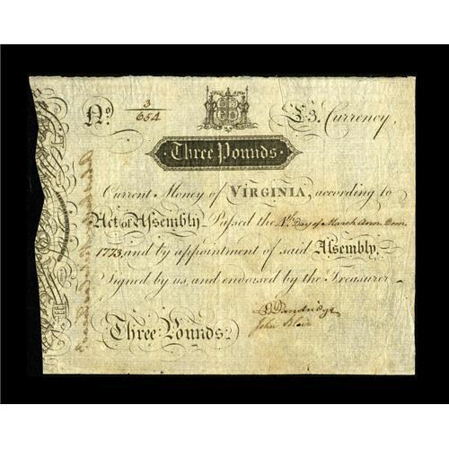 <B>Virginia March 4, 1773 $3 Extremely Fine-About New.</B></I> We have handled a tremendous amount of Colonial currency in our 40+ sales, including over a dozen examples from this very rare issue--none have even vaguely approached the quality of this incredible piece. But for a minute hole in the Blair signature, a few pinholes, and some extremely minor touches of circulation, this piece is as issued and impeccable. It's from a very large issue, printed on thin, weak paper that practically disintegrated at first touch. These notes were printed in London from plates engraved by Harry Ashby. They did not reach Virginia until September 1773, when they were completed, signed, indented, and released. The issue is rare in all grades, and prohibitively rare in high grade. This note is totally intact, beautifully margined, well signed, and problem-free. This is very likely one of the finest existing examples of this rare Virginia issue. We would not be surprised if this piece were the finest known example of its issue and denomination.<BR><BR><b>Shipping:</b> Coins & Currency (<a target="_blank" href="http://www.heritageauctions.com/common/shipping.php">view shipping information</a>)