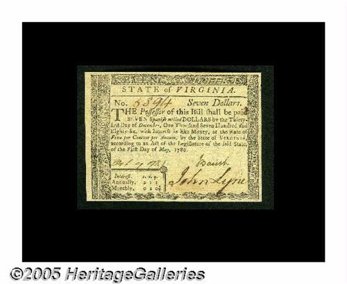 Virginia May 1, 1780 $7 Gem New. Fully signed on