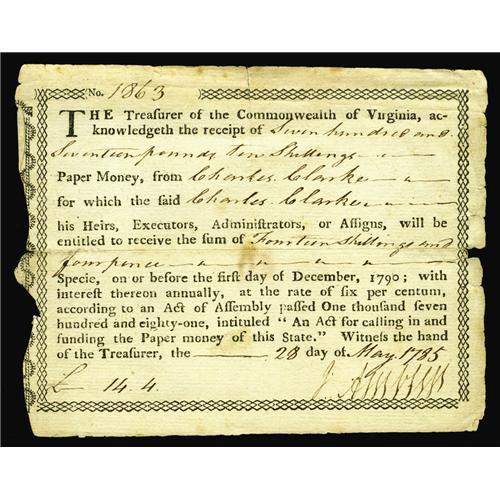 Virginia May 28, 1785 717/10s Very Fine-Extremely Fine Virginia May 28, 1785 [$717/10s Very Fine-Ext