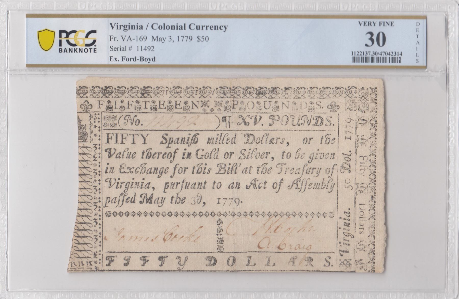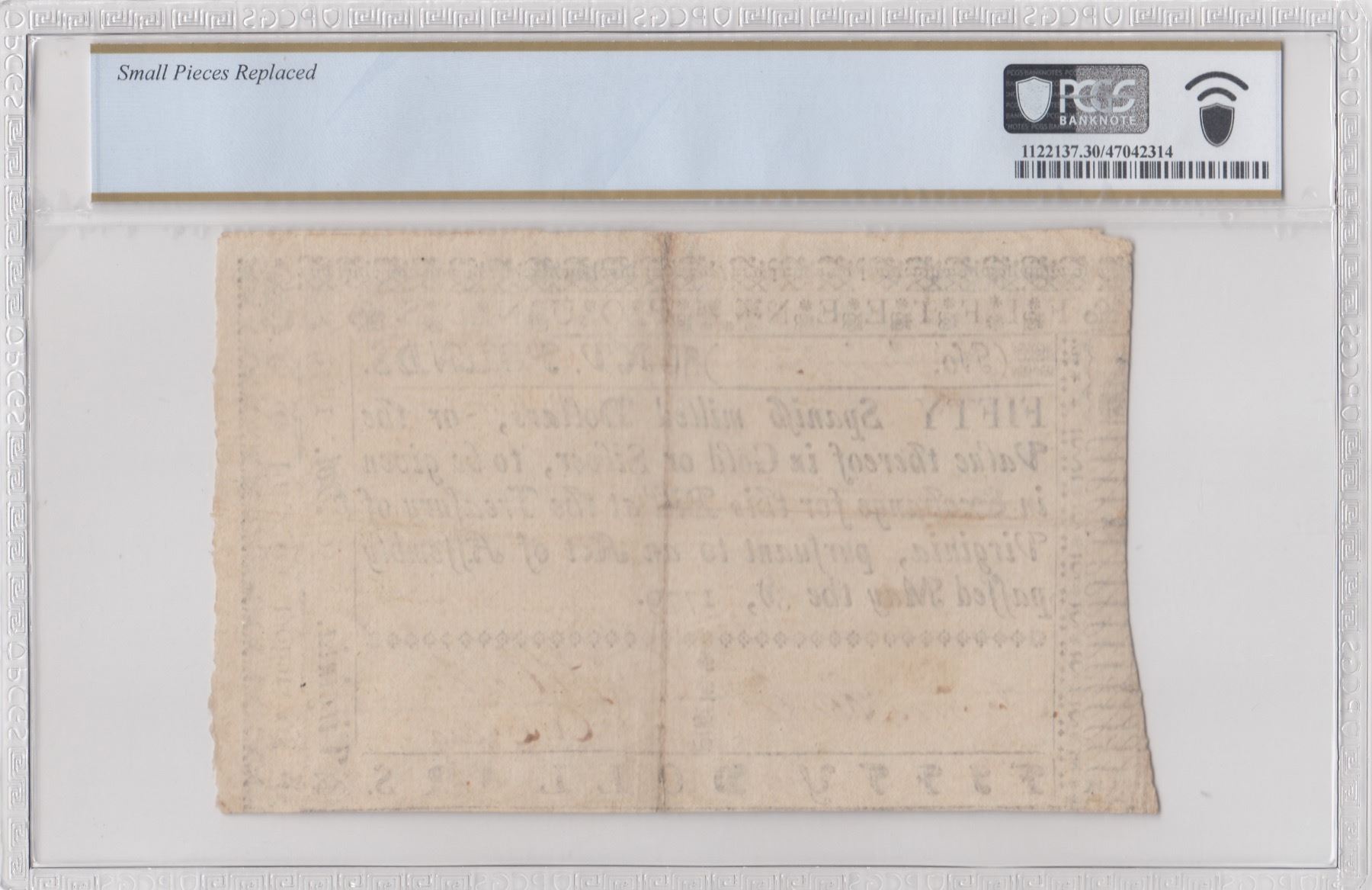 Virginia. May 3, 1779. Treasury of Virginia. Act of Assembly. Fifty Spanish Milled Dollars or Fifteen Pounds. Fr. VA-169. PCGS Very Fine-30 Details. Small Pieces Replaced. As illustrated.