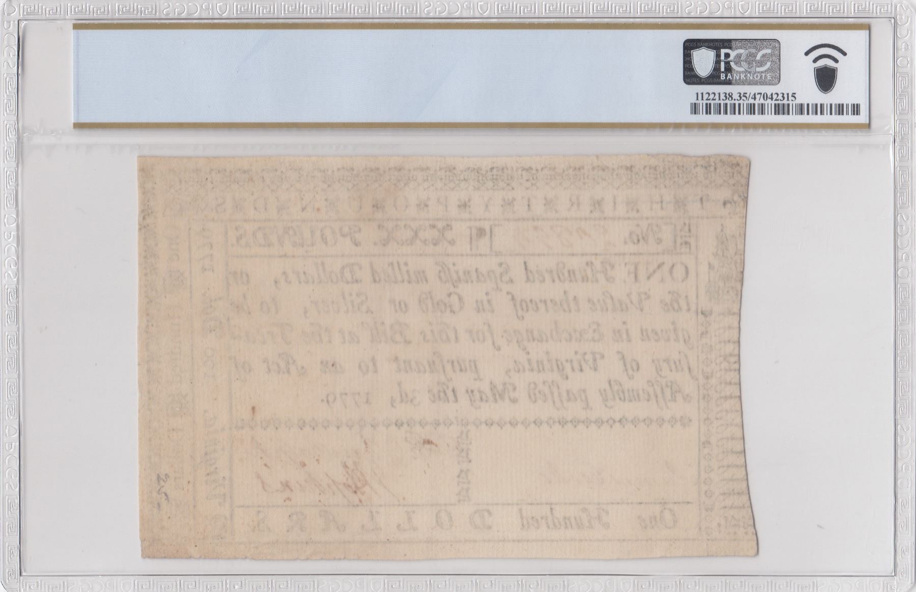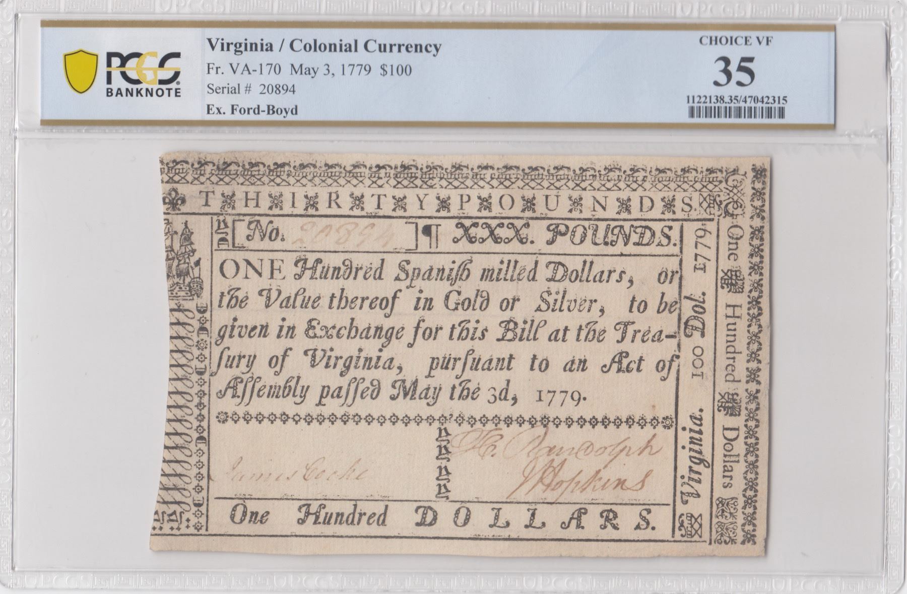 Virginia. May 3, 1779. Treasury of Virginia. Act of Assembly. One Hundred Spanish Milled Dollars or Thirty Pounds. Fr. VA-170. PCGS Choice Very Fine-35. No qualifiers.