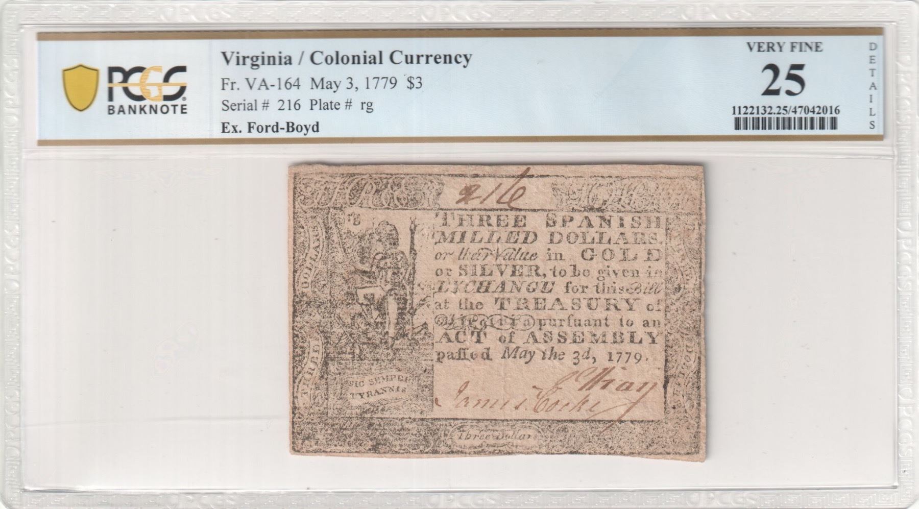 Virginia. May 3, 1779. Treasury of Virginia. Act of Assembly. Three Spanish Milled Dollars. Fr. VA-164. PCGS Very Fine-25 Details. Edge Repairs. As illustrated.