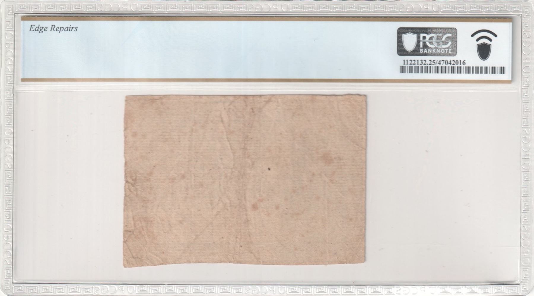 Description: Laid paper. Serial No. 2 [over 1] 16. Plate letters “rg.” Signed by J. Wray and James Cocke. Printer uncertain. Uniface. 95mm by 65mm. Creamy paper, lightly faded imprints, evenly margined if somewhat tight all around. Serial number and signatures strong. “Noted by Doug Ball and John Ford as ‘rare.’ That term was not tossed about frequently in that era, and not one person will ever argue the extreme acumen of the late Doug Ball and his knowledge of all Virginia currency from 1755 to 1861.” So wrote the Ford cataloger in testimony to the scarcity of the issue in all grades. Top-notch quality for the grade.