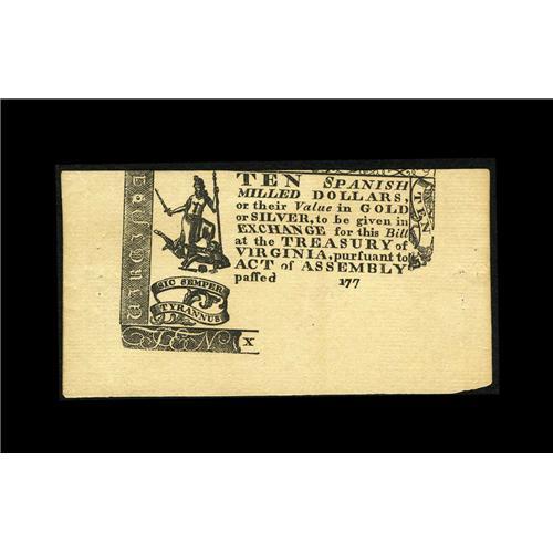 <B>Virginia May 5, 1777 $10 Extremely Fine-About New.</B></I> This is an interesting piece that shows an incorrect trim and a partial impression. Several pinholes are also noticed.