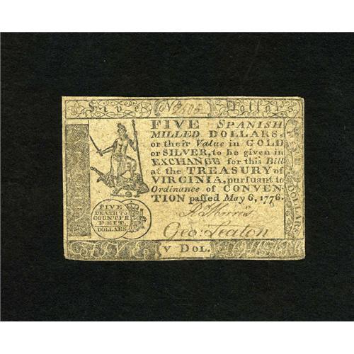 Virginia May 6, 1776 $5 Very Fine. Though a few folds a