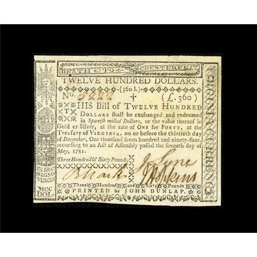 Virginia May 7, 1781 $1200 New.