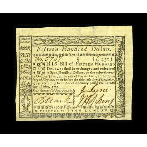 Virginia May 7, 1781 $1500 Very Fine-Extremely Fine. Th