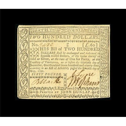 <B>Virginia May 7, 1781 $200 New.</B></I> Some handling is noted on this issue, yet is free of folds. We have previously handled only two other examples of this issue. A couple of expertly repaired splits are noted in the top margin.<BR><I>From The Collection of a Louisiana Gentleman.</B></I><BR><BR><b>Shipping:</b> Coins & Currency (<a target="_blank" href="http://www.heritageauctions.com/common/shipping.php">view shipping information</a>)