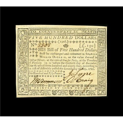 Virginia May 7, 1781 $500 Choice About New+++. From a t