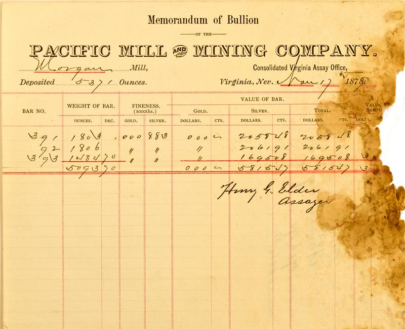 Was found by John Mackay and James G. Fair to process Comstock ores. Bars 391, 392 and 393 were assayed weighing a combined total of 5093.7 ounces valuing a combined total of $5,815.47. It is signed by Henry G. Elder. The right edge is rough. Considerable piece of the paper is missing and is ensconced by page discoloration. Overall Fair to Poor condition.
