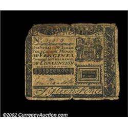 Virginia Notes. 1s3d and 10s from the July 17, 1775 issue, both of which grade Fine; $50 from the October 16, 1780 issue grading Very Fine but backed with cardboard; and $50 from the March 1, 1781 issue that grades Fine but is badly damaged. 4 notes Important notice: We expect to be auctioning lots at the rate of 200-250 per hour. Sometimes eBay Premier live bid software cannot keep up with that pace, so we strongly recommend that you place a realistic proxy bid now as insurance to avoid disappointment. Also please note that all Heritage/CAA lots purchased through eBay Premier carry a 20% Buyer's Premium. Please make sure you read the Terms and Conditions.