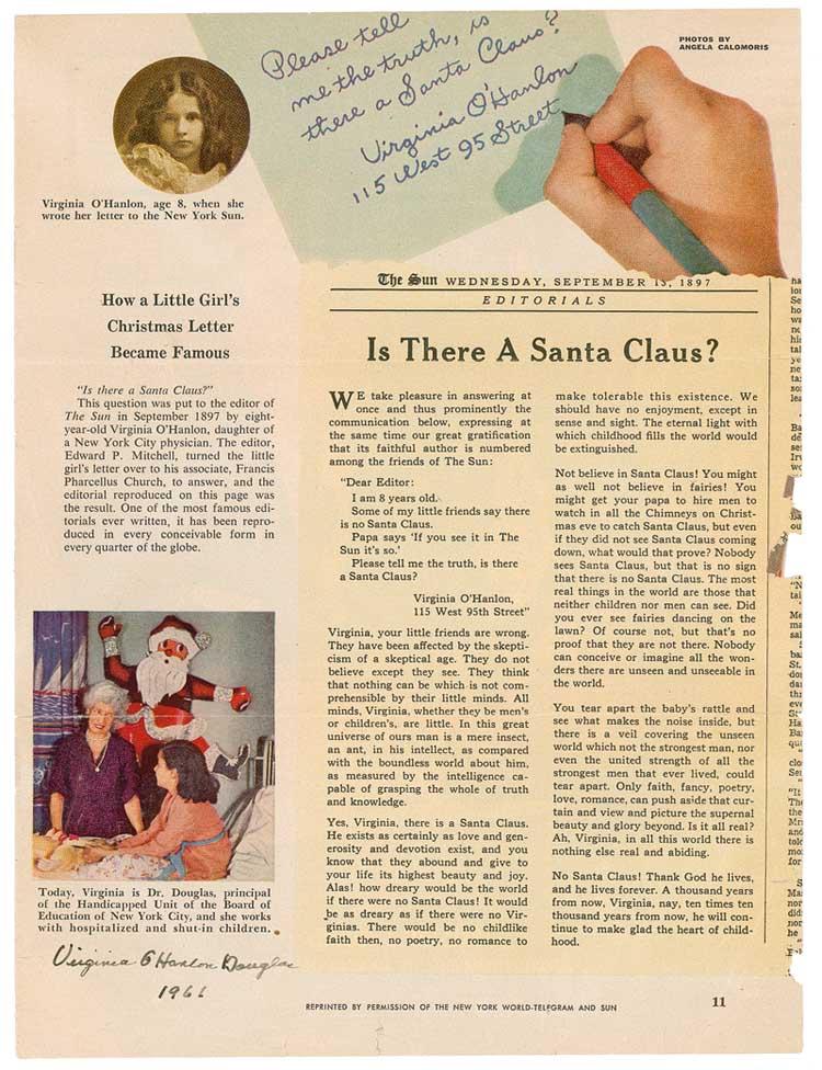 Young girl who inspired the “Is There a Santa Claus?” editorial appearing in the September 21, 1897, edition of the New York Sun. The editorial, which included the famous reply "Yes, Virginia, there is a Santa Claus,” has become an indelible part of popular Christmas lore in the United States and Canada. Color magazine page, 8.5 x 11.5, bearing the first page of an article about O’Hanlon and her famous letter to the New York Sun, signed in the lower left corner in black ink, “Virginia O’Hanlon Douglas 1961.” In very good condition, with scattered creases, edge tears, and a couple small separations along horizontal mailing folds. RRAuction COA.