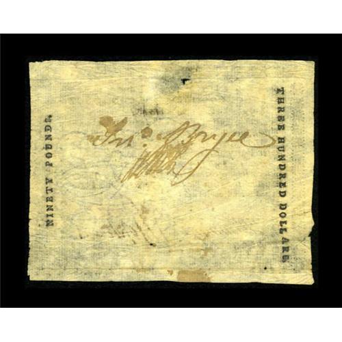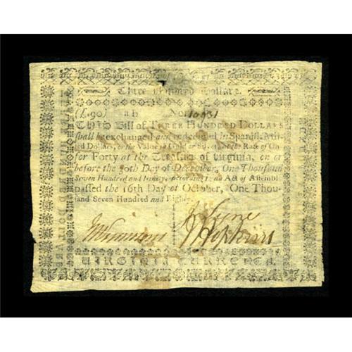 <B>Virginia October 16, 1780 $300 Very Fine.</B></I> The signatures remain strong and this example is exceptionally well margined. This note is printed on extraordinarily thin, tissue-like paper that tended to disintegrate shortly after entering circulation. This does not take into effect the almost 230 years of storage between then and now. These notes are seldom seen without serious faults, with this example having only trivial edge blemishes, a tiny hole at top center, plus a couple of pinholes.<BR><BR><b>Shipping:</b> Coins & Currency (<a target="_blank" href="http://www.heritageauctions.com/common/shipping.php">view shipping information</a>)