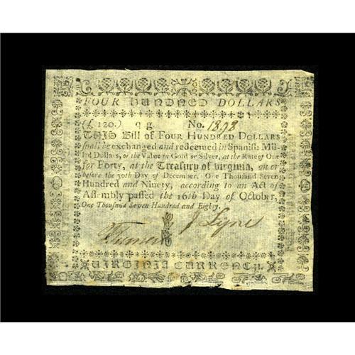 Virginia October 16, 1780 $400 Very Fine. The paper for