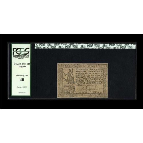 <B>Virginia October 20, 1777 $15 PCGS Extremely Fine 40.</B></I> This is a well margined and very well centered example of this issue with the handwritten dates which appears to be separated from the New grade by some minor corner handling.<BR><I>From The Troy Wiseman Collection</B></I>