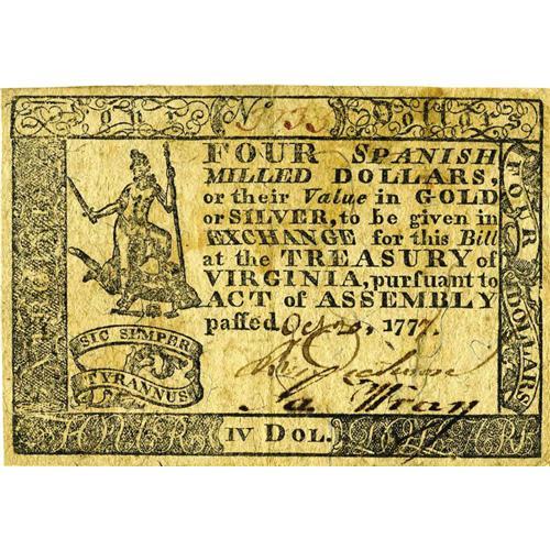 <B>Virginia October 20, 1777 $4 Extremely Fine.</B></I> Well margined and with dark signatures, this is a solid Virginia example.