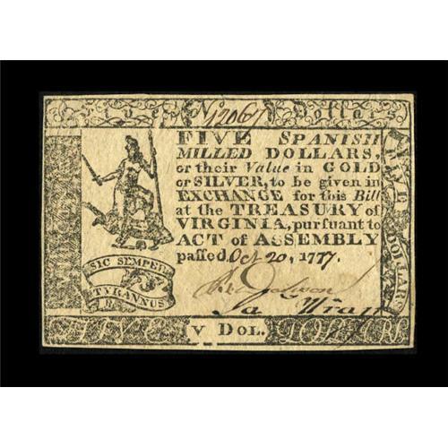 <B>Virginia October 20, 1777 $5 About New.</B></I> A scarce issue as auction appearances are quite infrequent with this only the second offering by us. A soft fold and some adhesive residue on all four corners of the back are the only blemishes on this otherwise handsome note.<BR><BR><b>Shipping:</b> Coins & Currency (<a target="_blank" href="http://www.heritageauctions.com/common/shipping.php">view shipping information</a>)
