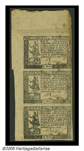 <B>Virginia October 20, 1777 $6, $4, $8 Strip of Three About New.</B></I> With the exception of the 1780 Guaranteed Issue, Virginia multiples are never seen. This one has the full sheet selvage at the top and left and normal, note-size margins at the bottom and right. The right of the $6 note is affected by some staining and an edge nick. The $4 and $8 notes have a few very minor stains but individually grade Choice New. A great Colonial item for the Virginia specialist or the advanced Colonial collector.