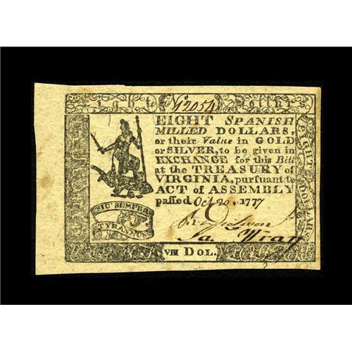 <B>Virginia October 20, 1777 $8 Gem New.</B></I> This is an enormously margined example of this hand signed date issue that has wonderful printing, bold signatures, and superb embossing. There are a few small light toning areas that are of no consequence whatsoever. Recently we have had a couple of near Gem examples that have realized around $900 and this note is clearly superior to those.<BR><BR><b>Shipping:</b> Coin/Currency (<a target="_blank" href="http://www.heritageauctions.com/common/shipping.php">view shipping information</a>)