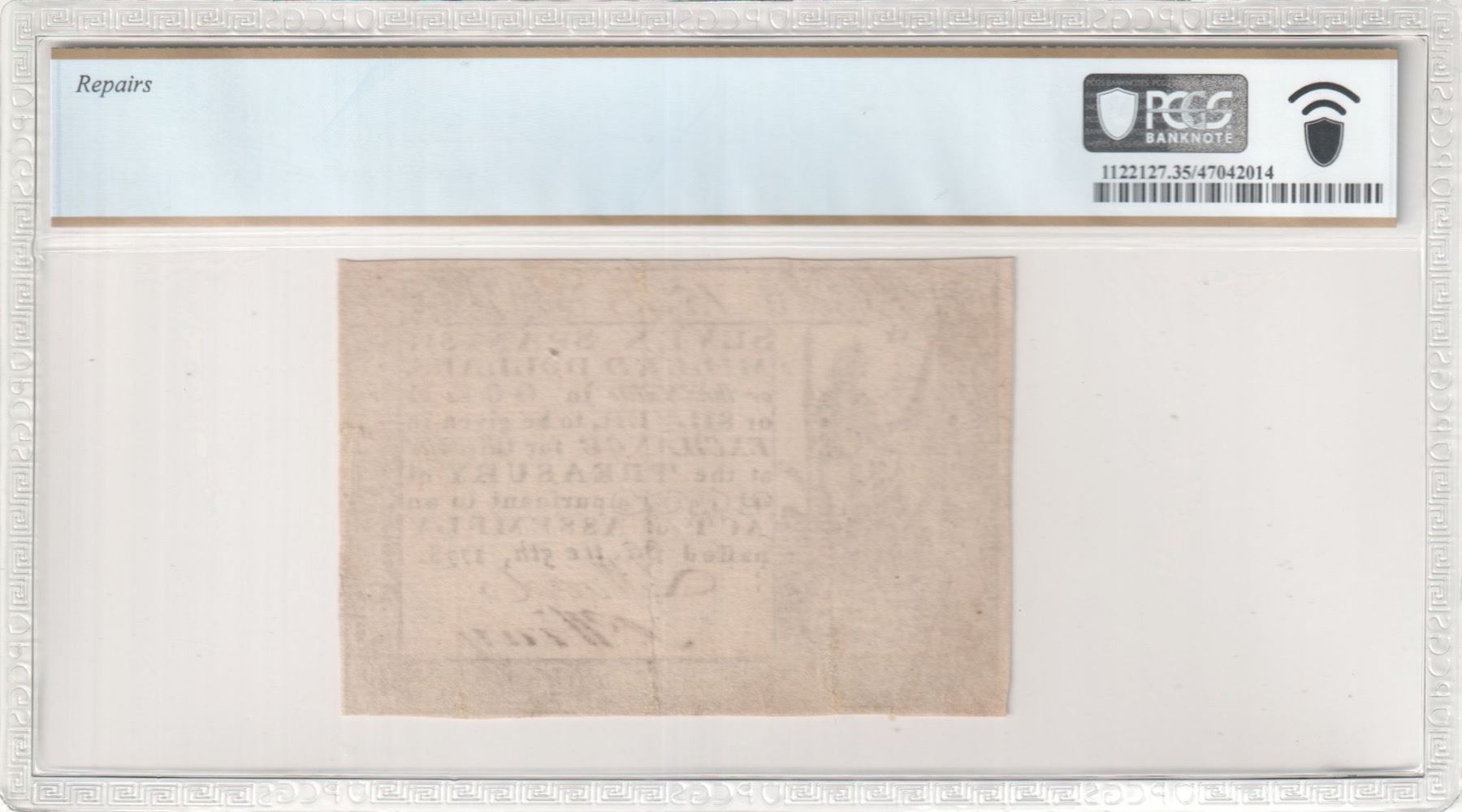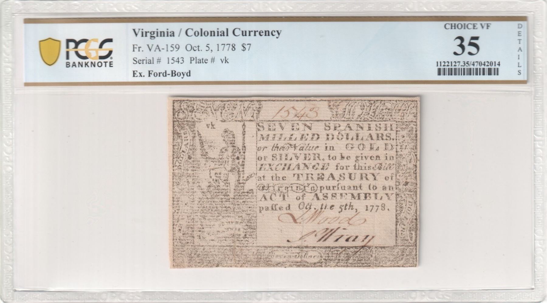 Virginia. October 5, 1778. Treasury of Virginia. Act of Assembly. Seven Spanish Milled Dollars. Fr. VA-159. PCGS Choice Very Fine-35 Details. Repairs. As illustrated.