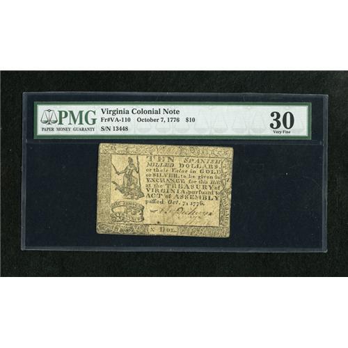 <B>Virginia October 7, 1776 $10 PMG Very Fine 30.</B></I> A splendid example of this Virginia issue that should find a happy new home in someone's collection.<BR><BR><b>Shipping:</b> Coins & Currency (<a target="_blank" href="http://www.heritageauctions.com/common/shipping.php">view shipping information</a>)