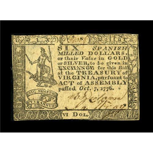 Virginia October 7, 1776 $6 Choice Very Fine. Closely m